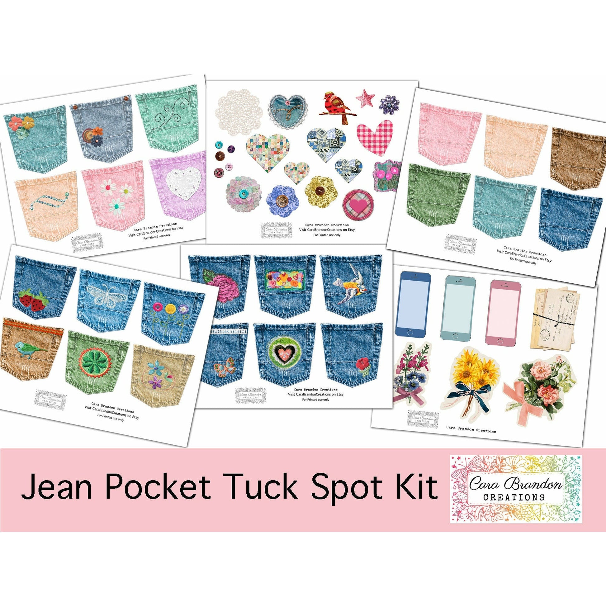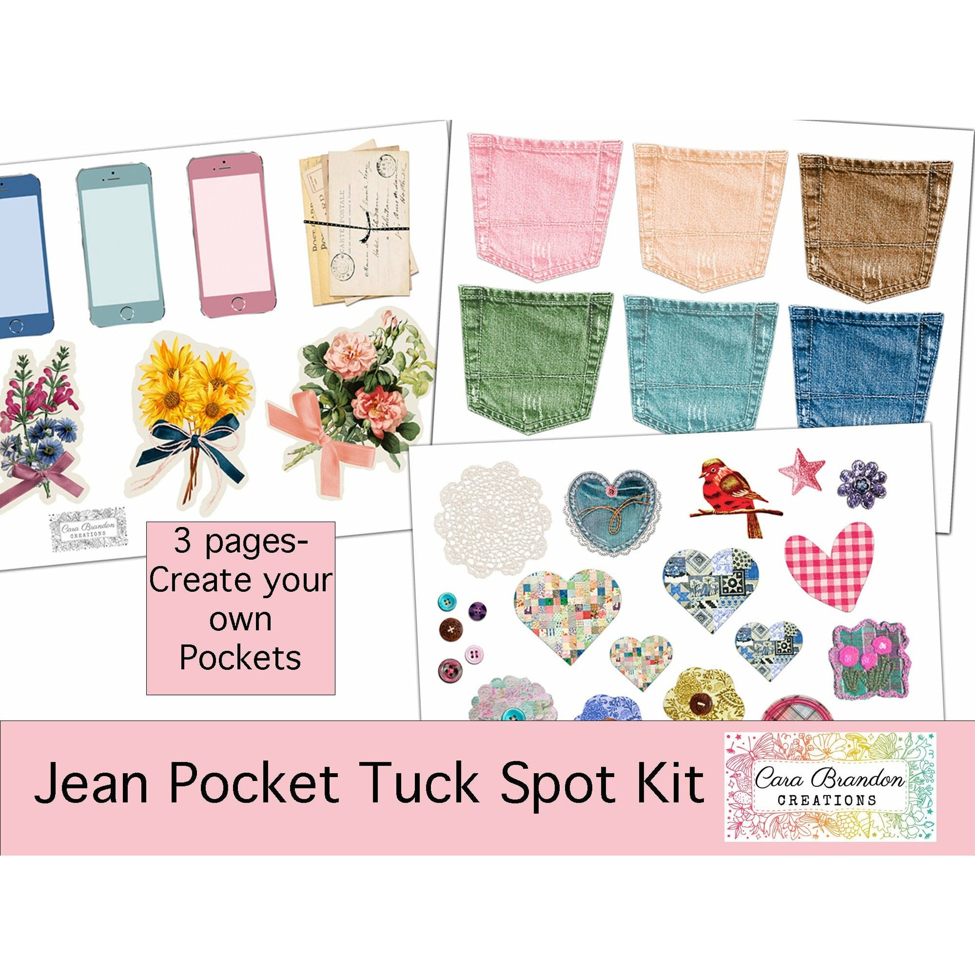 A total of 18 jean pockets 1 page of plan pockets 1 page fussy cut items to decorate the pockets 1 page of pocket tucks.