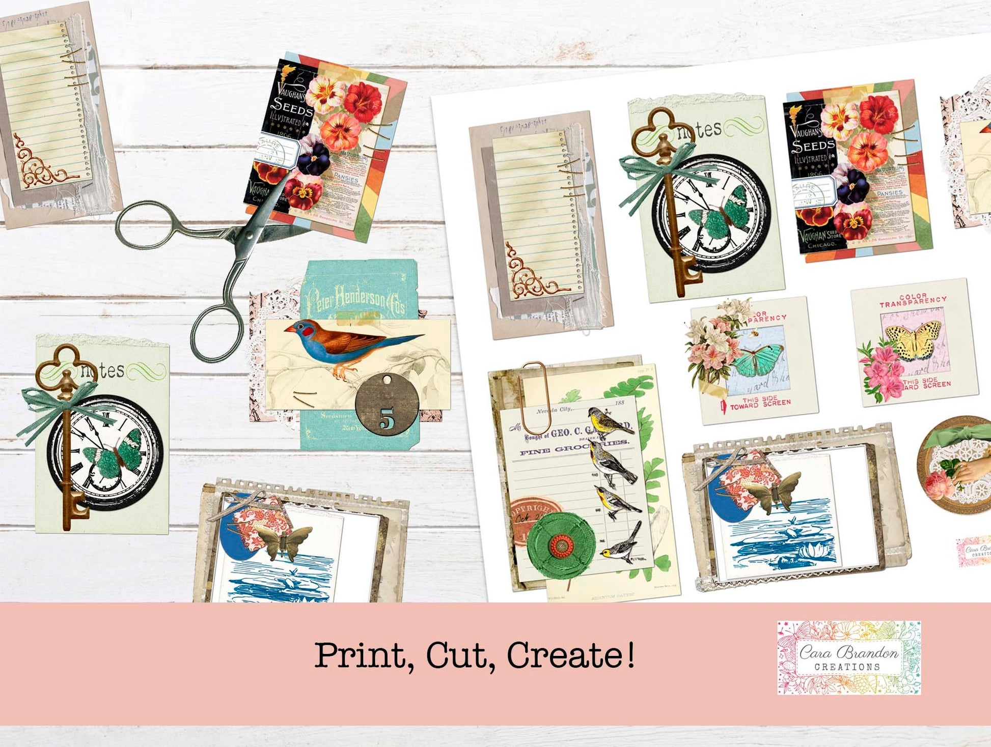 Gorgeous digital of ephemera clusters for those times you want a flat element in a journal. I highly recommend this printable for those who have a hard time finding all the bits and pieces. Print for any time you need a pretty cluster for junk journal, commonplace journal or planner. No bulk and all the beautiful things we love!!