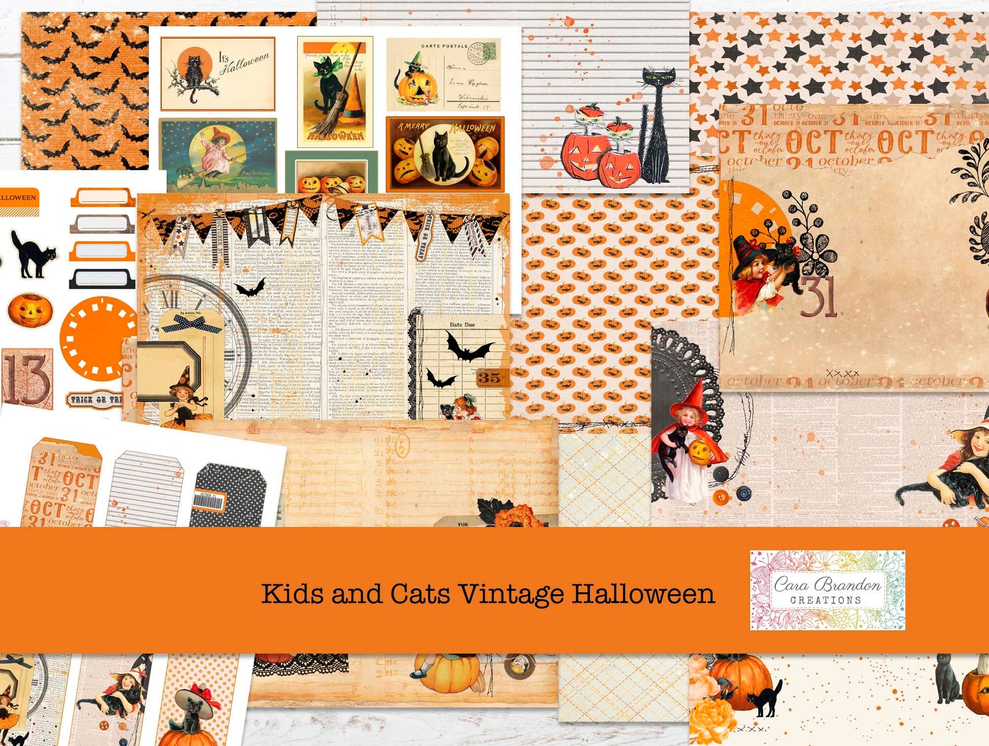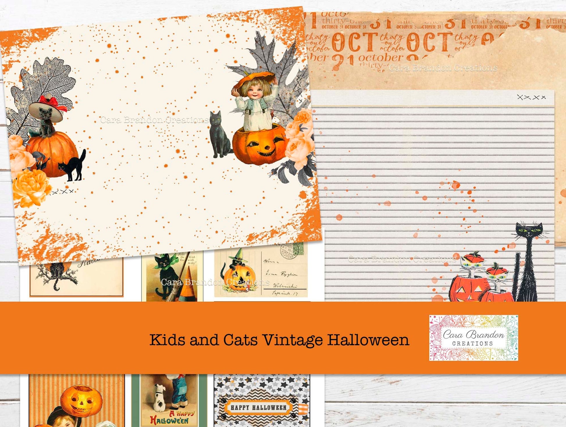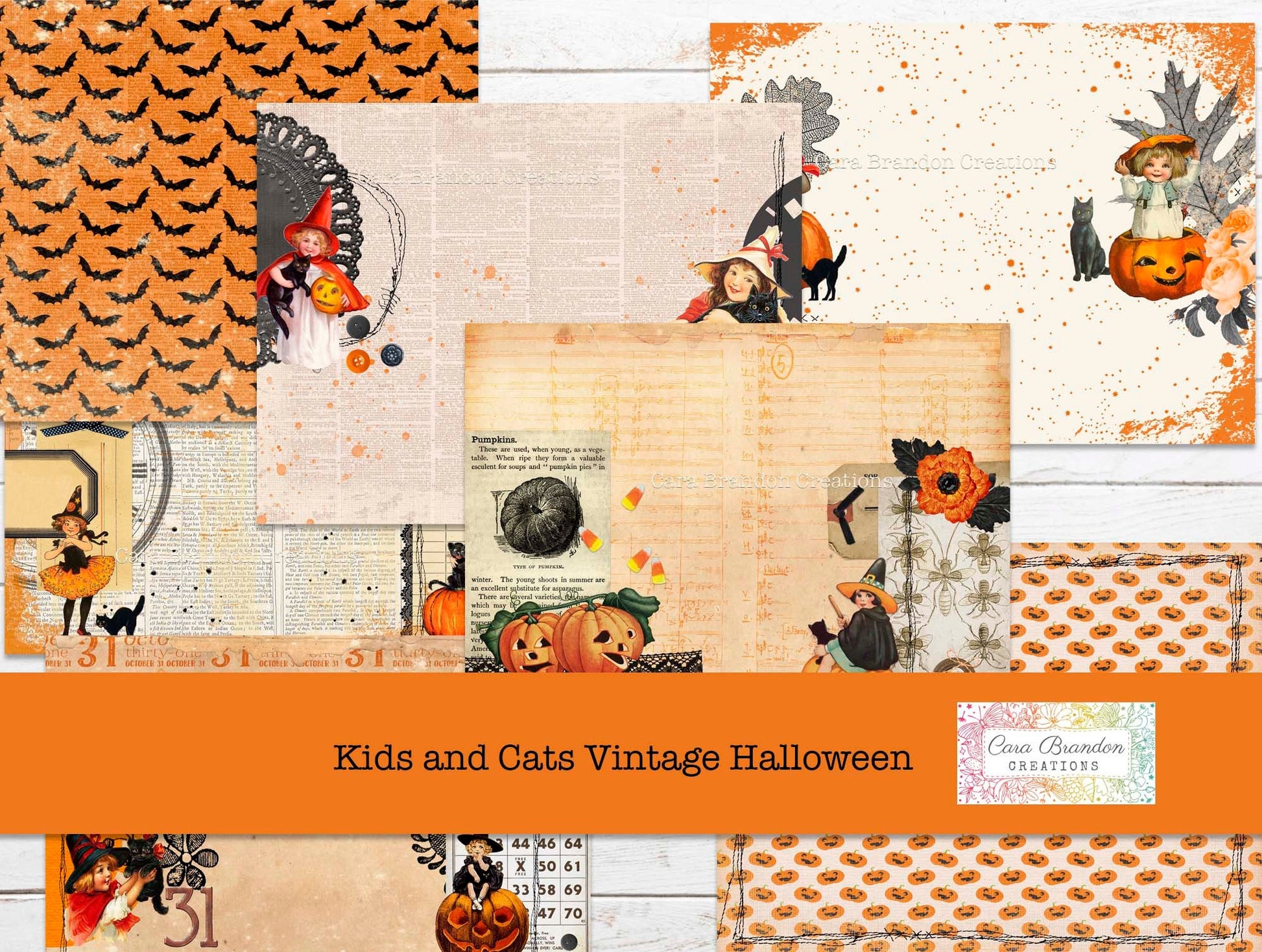 Kids and Cats Vintage Halloween Digital journal kit is full of vintage and retro images of kids and black cats.