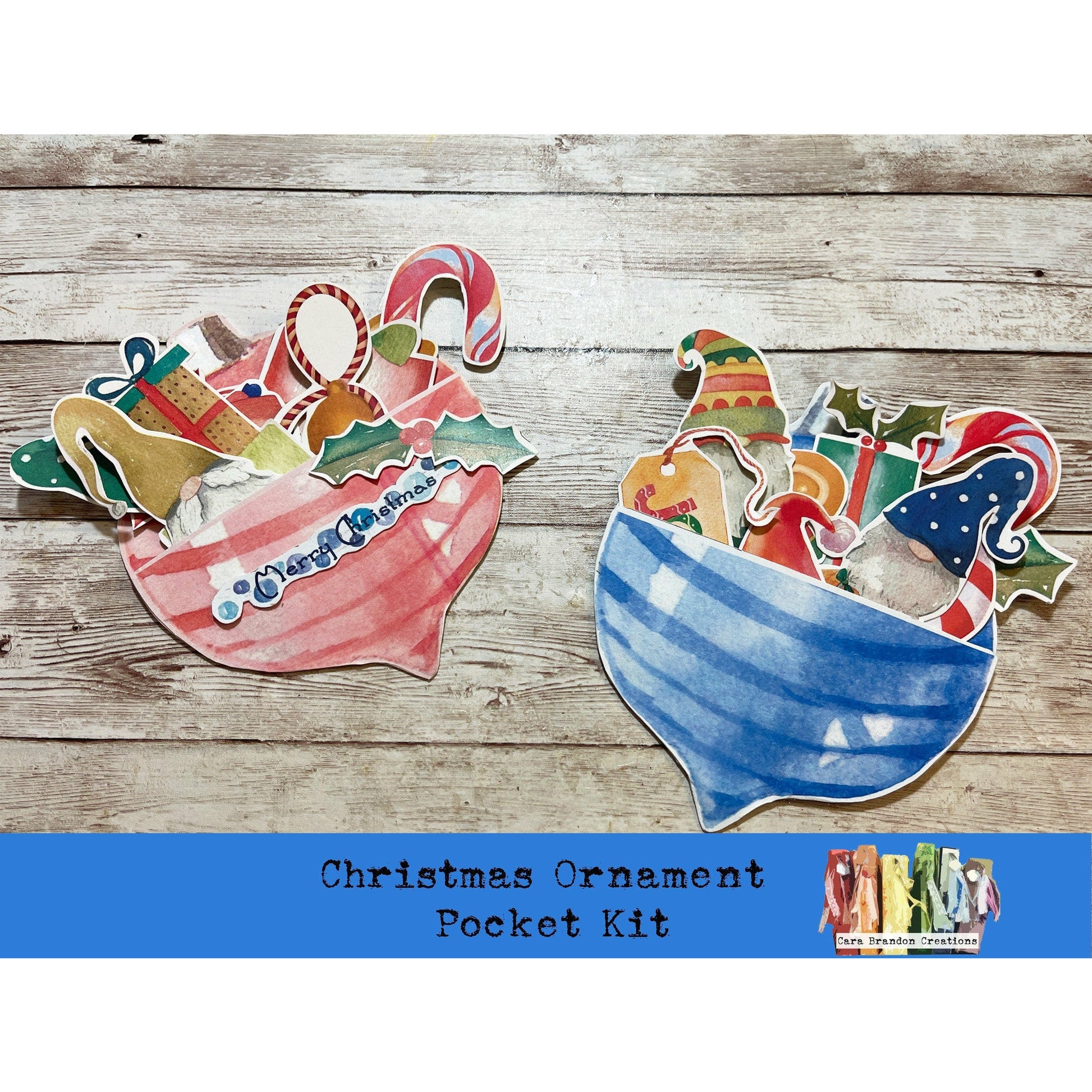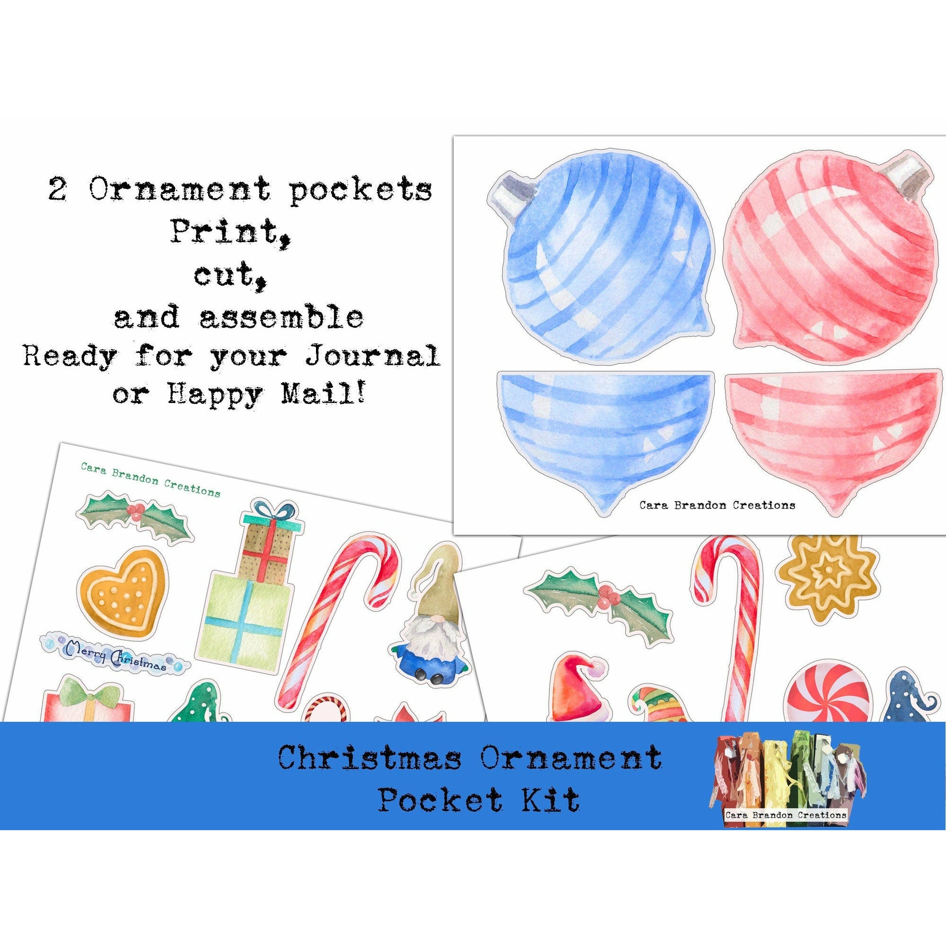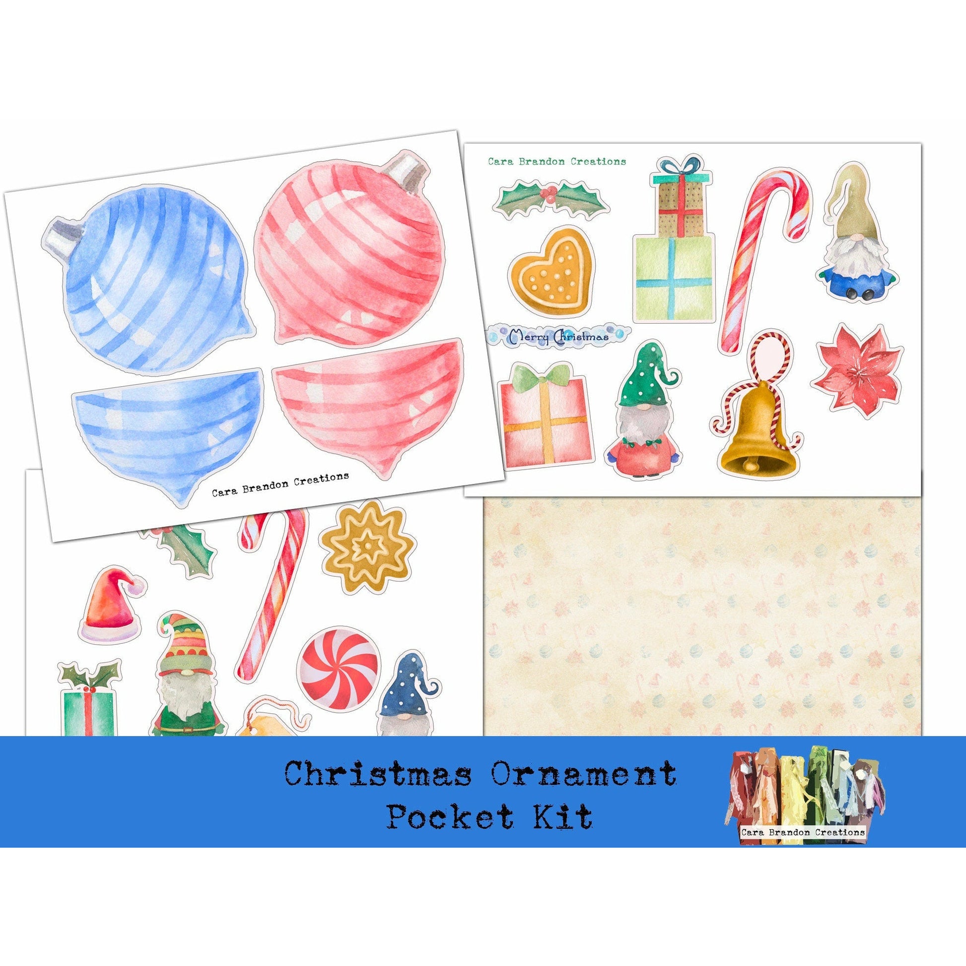 The kit contains two ornament pockets as well as 2 pages of fussy cut images including gnomes, candy canes, mistletoe and cookies. These pockets can be used as an embellishment in a junk journal or for snail mail.