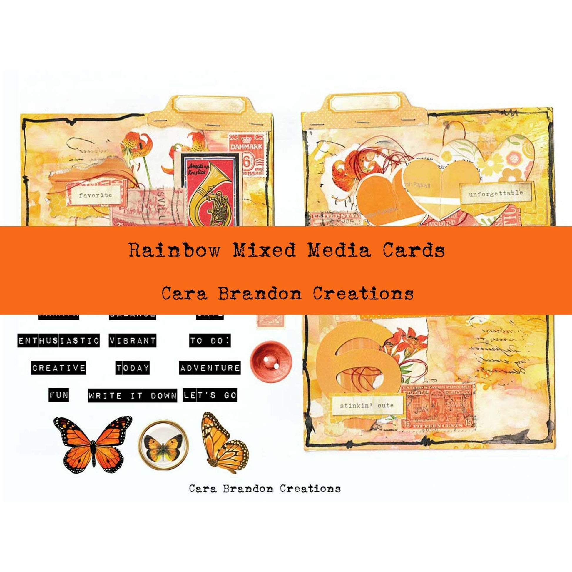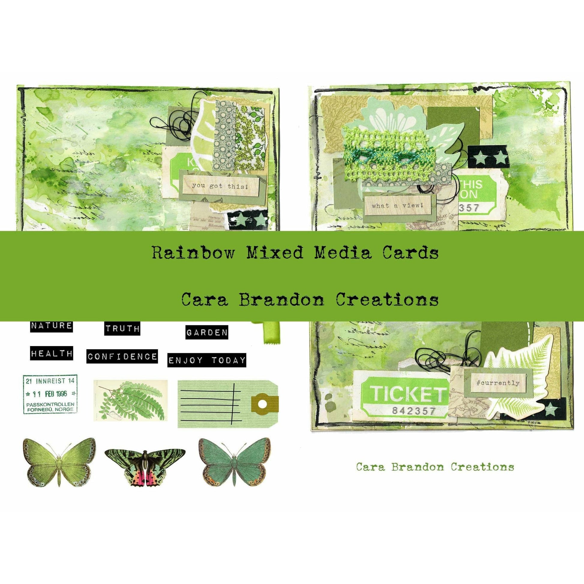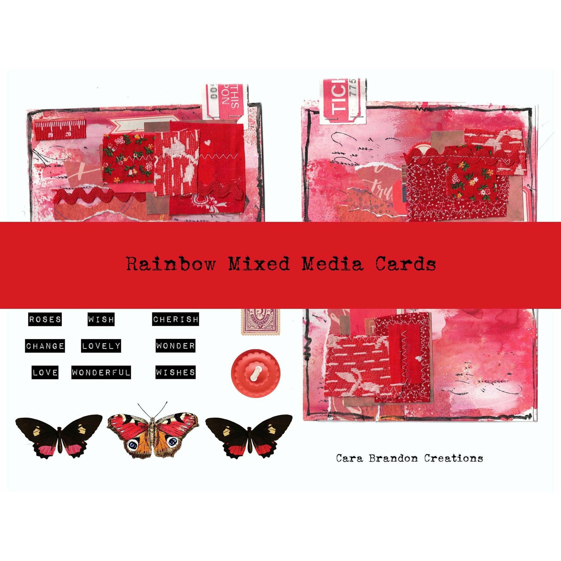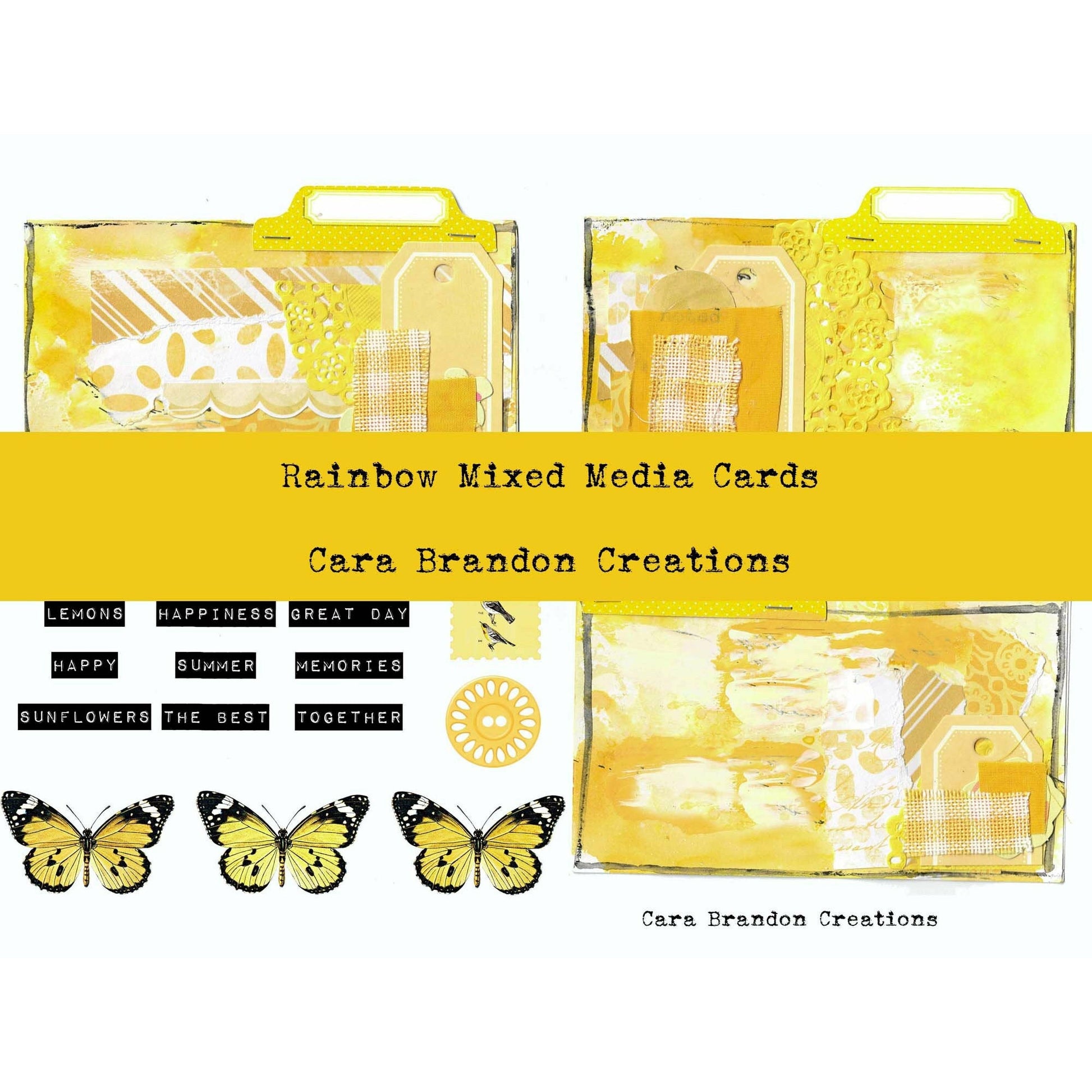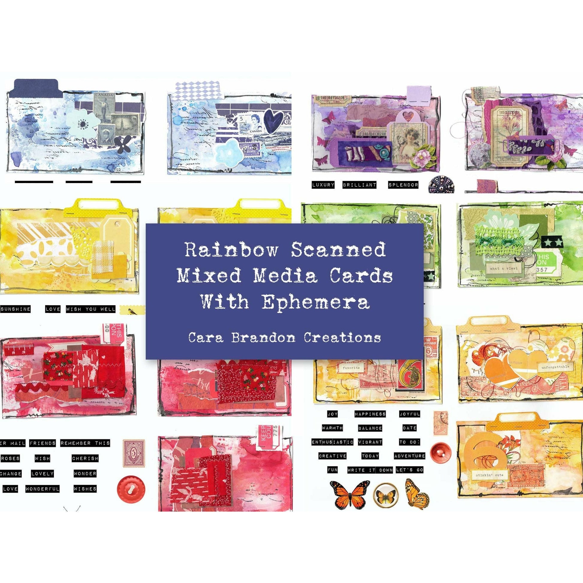 There are 3 handmade and scanned Index Mixed media cards along with inspirational words that go with each color, butterflies and other ephemera.